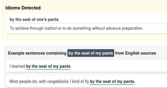 So much of writing and communicating in another language is understanding the common idioms and phrases that are peppered throughout. Sentence Stack contains idiom detection so that if you search for an idiom, this is detected and your search results will include a description of the idiom. Consider the phrase couch potato or the idiom by the seat of my pants. Sentence Stack displays a helpful description and a list of sentences containing the phrase: